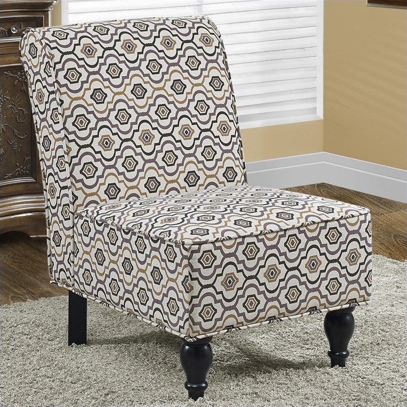 Description : Monarch - Accent Chairs - I 8113 - Add a unique piece to your space with this accent chair featuring a straight plush back, a generously cushioned and spacious seating, and slightly tapered legs finished in a sturdy solid-wood. Its lower height and modern grey circular patterned fabric make this accent chair an undeniable focal point in any room. Blends well with most decor; Padded seat cushion and back. Specifications: Overall Product Dimension: 32" H 32" W 27" D ; Weight: 32lb.Online Order for Monarch Circular Fabric Accent Slipper Chair in Gray Geometric Pattern